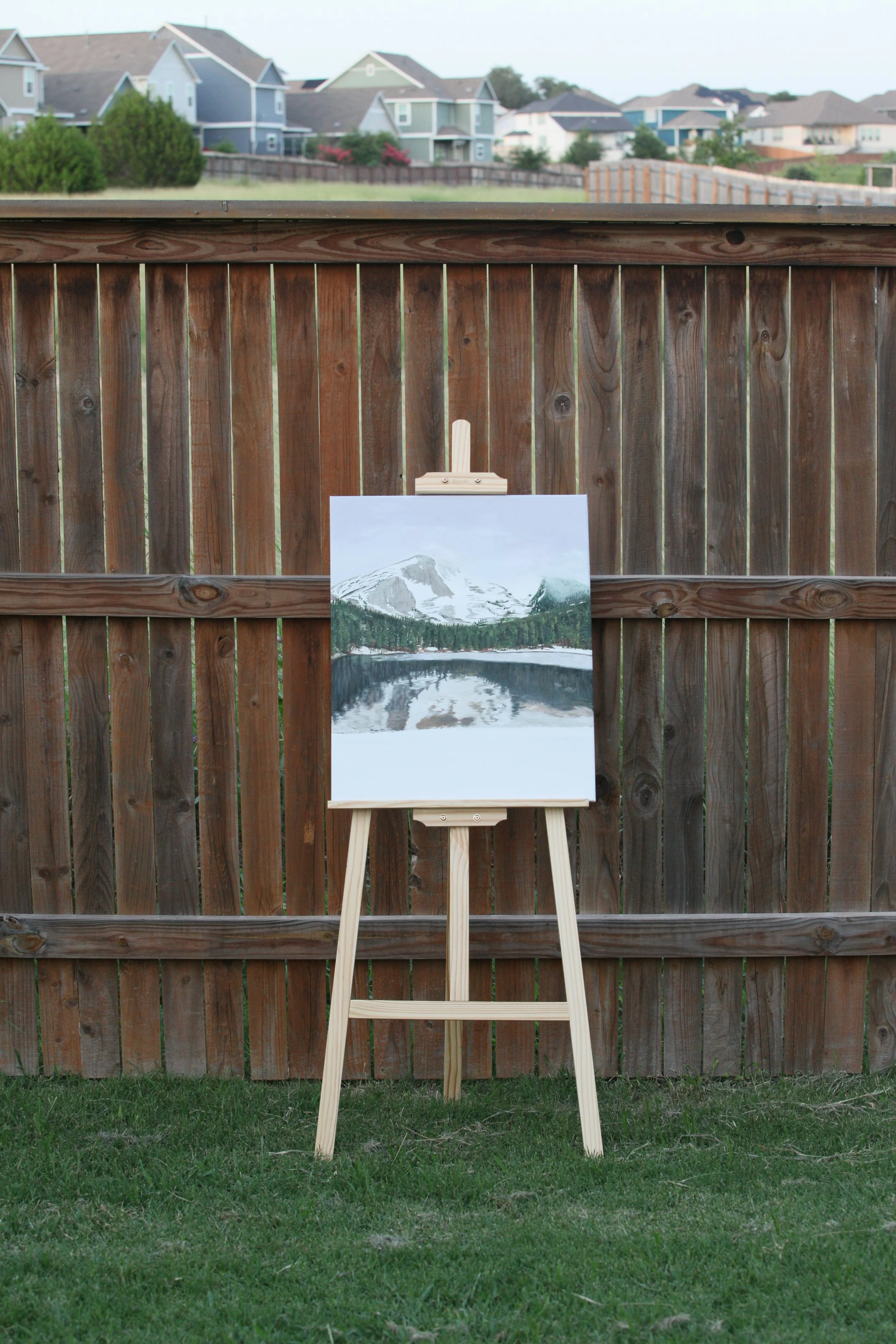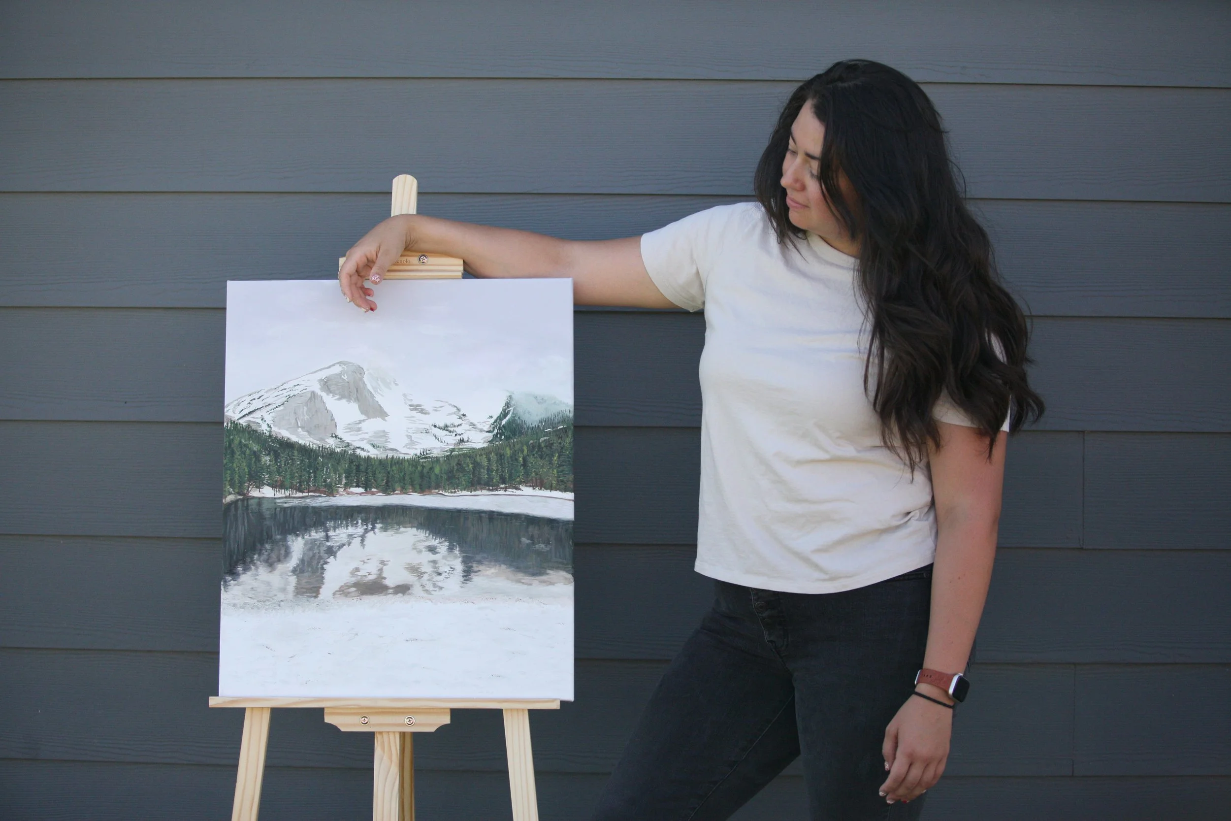 This peaceful landscape painting captures the quiet majesty of snow-capped mountains towering above a still, reflective lake. Evergreen trees frame the scene, their deep greens contrasting beautifully with the crisp whites of freshly fallen snow. The glassy water below mirrors the mountain peaks and trees, adding a sense of calm and balance to the composition. With its cool tones and tranquil atmosphere, this piece invites viewers to pause, breathe deeply, and get lost in the serene beauty of nature. Perfect for bringing a sense of calm and wonder into any space. ***All prints are on Cold Press Fine Art Paper.